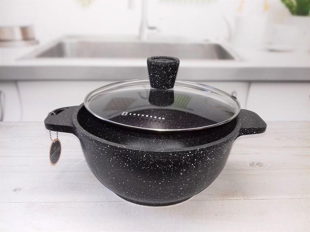 Каструля з гранітним покриттям Edenberg виготовлена з литого алюмінію й рівномірно прогрівається як по дну, так і по стінках посуду.