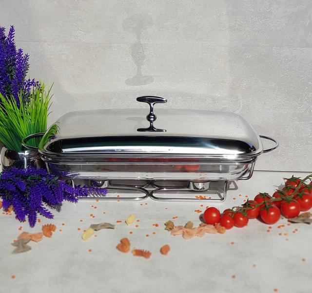 - Зручний посуд для зберігання їжі гарячого й ароматного зі скляного контейнера, металевої кришки зі зручною ручкою та хромованої підставки зі свічниками для підігрівання.